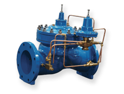 This valve effectively limits flow to a pre-determined maximum by maintaining a continuous pressure differential across an orifice. When the differential is below the set-point, the valve opens to meet demand. As the differential approaches or exceeds the set-point, the pilot reacts to small pressure changes, modulating the main valve to slightly close and restrict flow to the pre-set maximum.